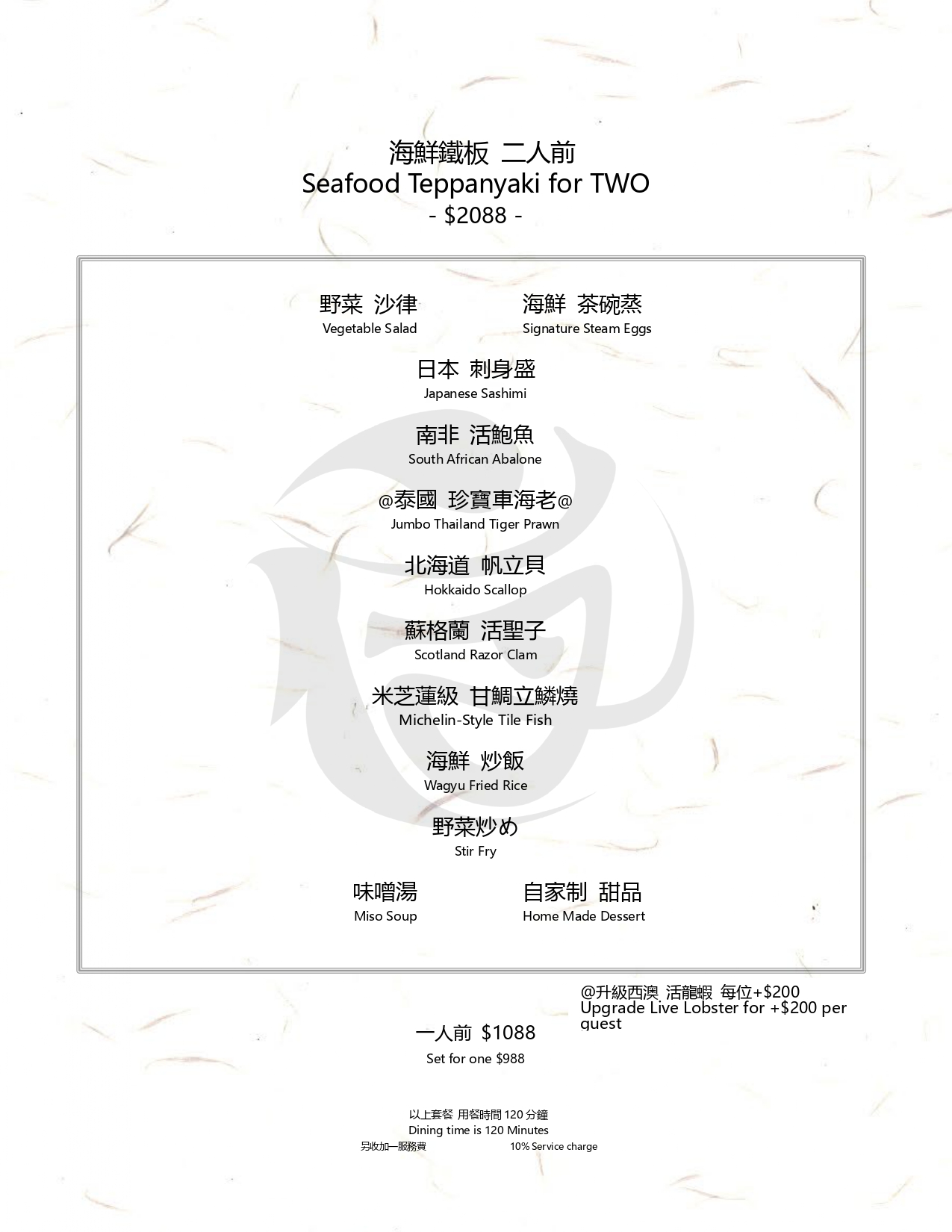 以上廚師料理套餐 用餐時間180分鐘